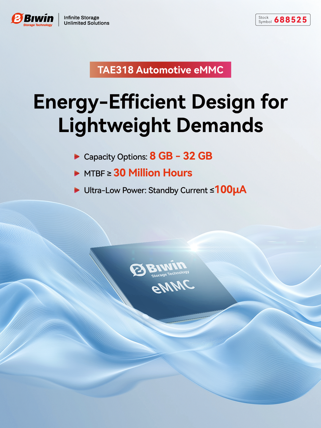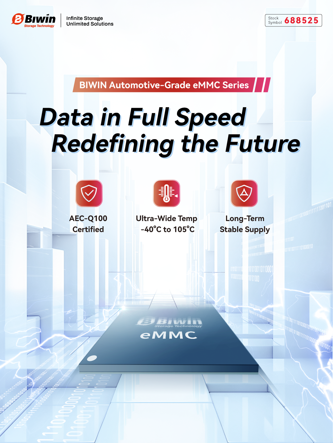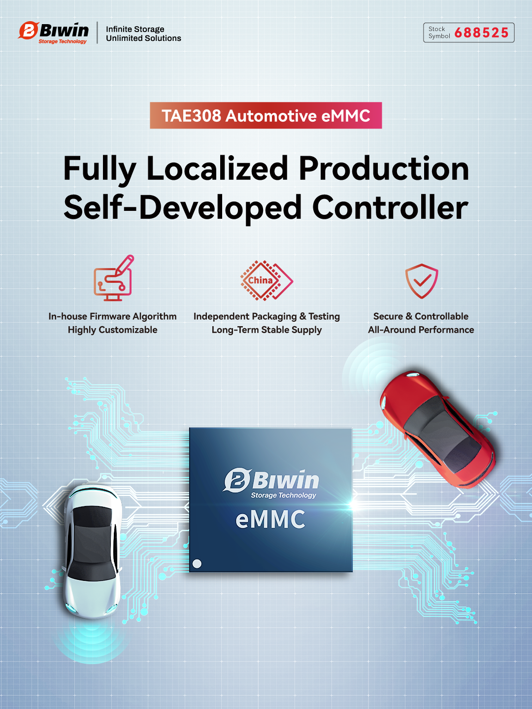 BIWIN’s automotive-grade eMMC series includes the TAE308 full-localization solution and the TAE318 compact-capacity solution, designed to meet the diverse requirements of intelligent vehicles—ranging from high-speed data transfer and low latency to superior reliability and domestic substitution. The entire lineup is certified to AEC-Q100 automotive reliability standards, supports operation from -40℃ to 105℃, and offers long-term supply assurance. These features make BIWIN eMMC solutions ideal for applications in intelligent cockpits, autonomous driving, and in-vehicle infotainment (IVI) systems, among other critical use cases.