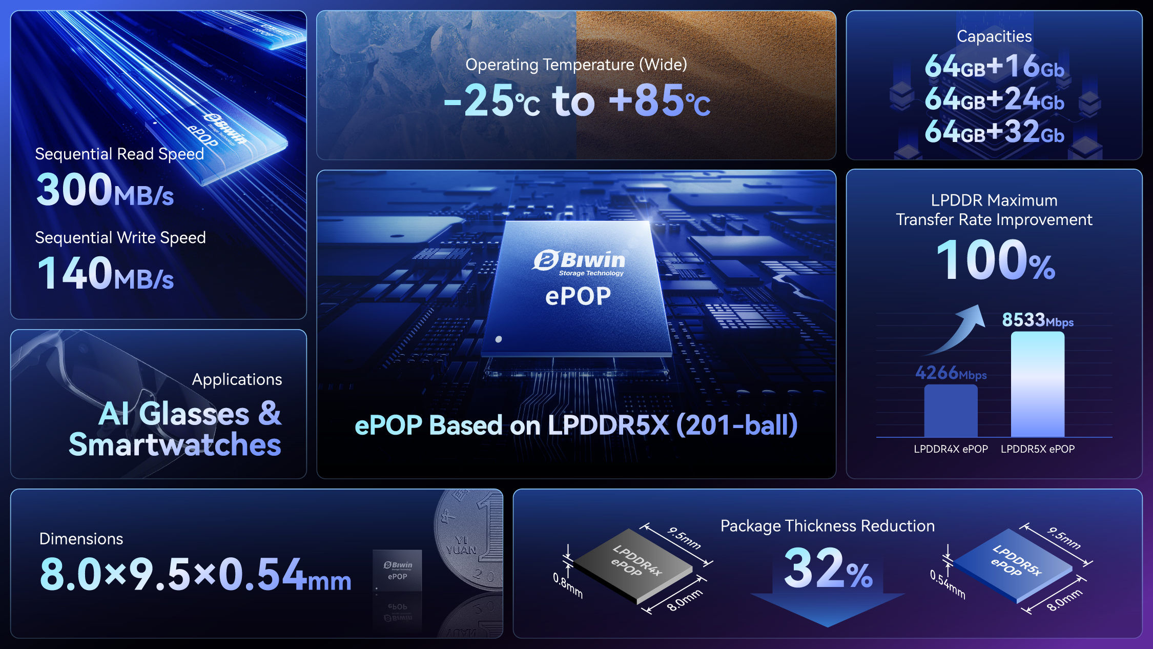 The increasing requirements of wearables such as AI glasses and smartwatches for ultimate thinness and lightness, extended battery life, and advanced multimodal AI capabilitiess are propelling the demands for storage and memory solutions that are more compact, energy-efficient, and high-performing. BIWIN ePOP5x stands as the “small but powerful” solution designed for portable intelligent terminals backed by its ultra-small size, superior efficiency and stable reliability, perfect for thin and light devices to unleash surging AI capabilities.