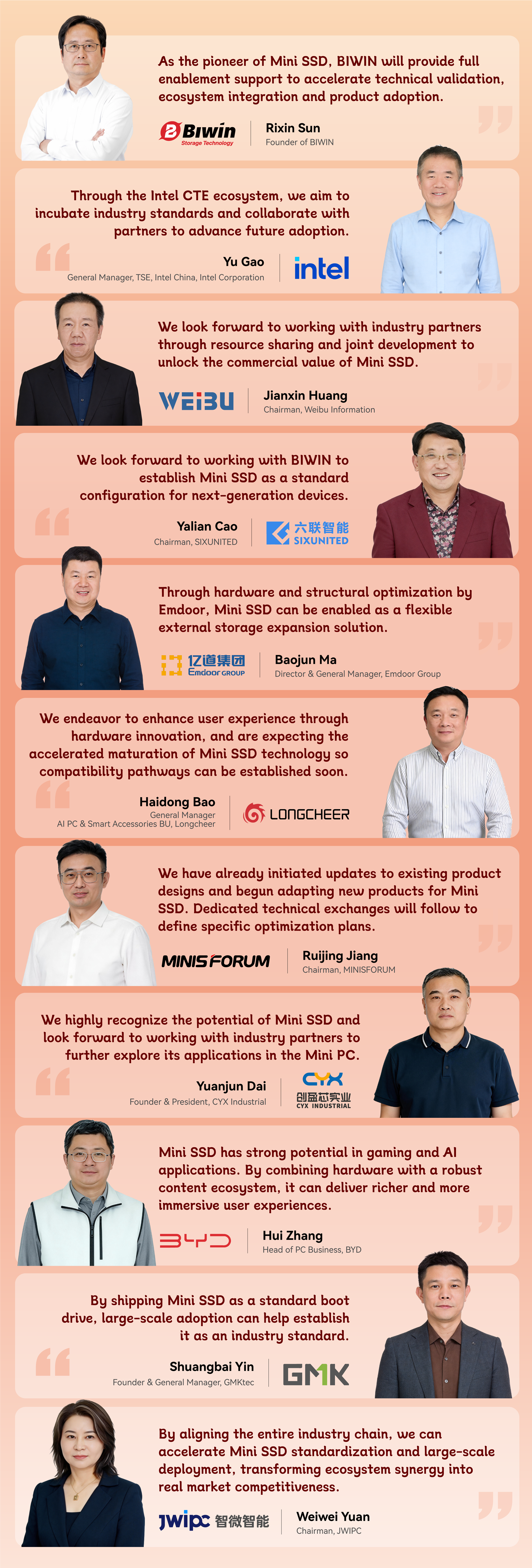 Leading companies across the industry chain, including Intel, BIWIN, Longcheer, BYD Electronics, Luxshare, Emdoor, Weibu, JWIPC, CYX Industrial, MINISFORUM, Decenta, and SIXUNITED, reached a strategic consensus to jointly build the Mini SSD industry ecosystem, marking a significant step toward large-scale adoption of this emerging storage form factor.